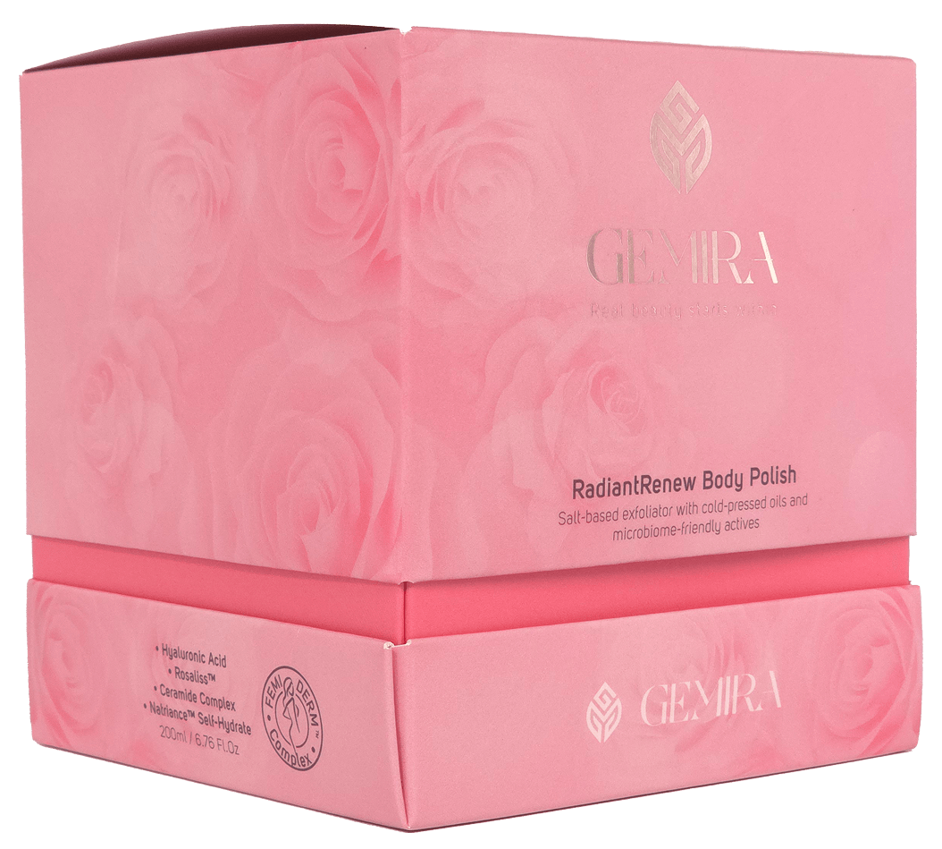 ™RadiantRenew הוא פילינג גוף טבעי, יבש וללא מים, המבוסס על מלחי ים המלח גרגריים ושמנים בכבישה קרה – חוחובה, סקוולאן ורוז היפ. בזמן הניקוי הם מזינים את העור, מותירים אותו גמיש, רגוע ובעל ברק טבעי.